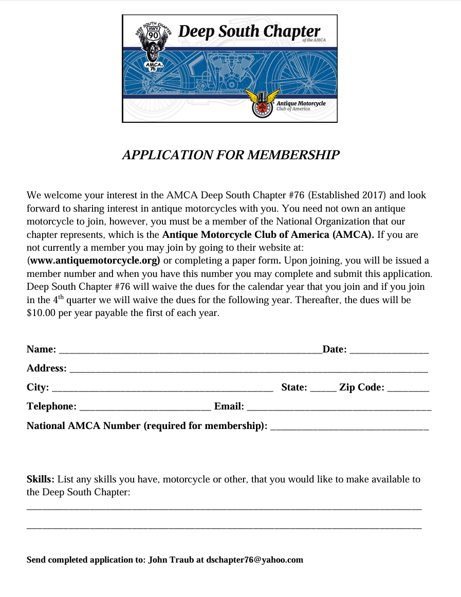 To become a member of the Deep South Chapter 76 of the Antique Motorcycle Club of America, you will first need to become a member of the National Antique Motorcycle Club of America (AMCA).